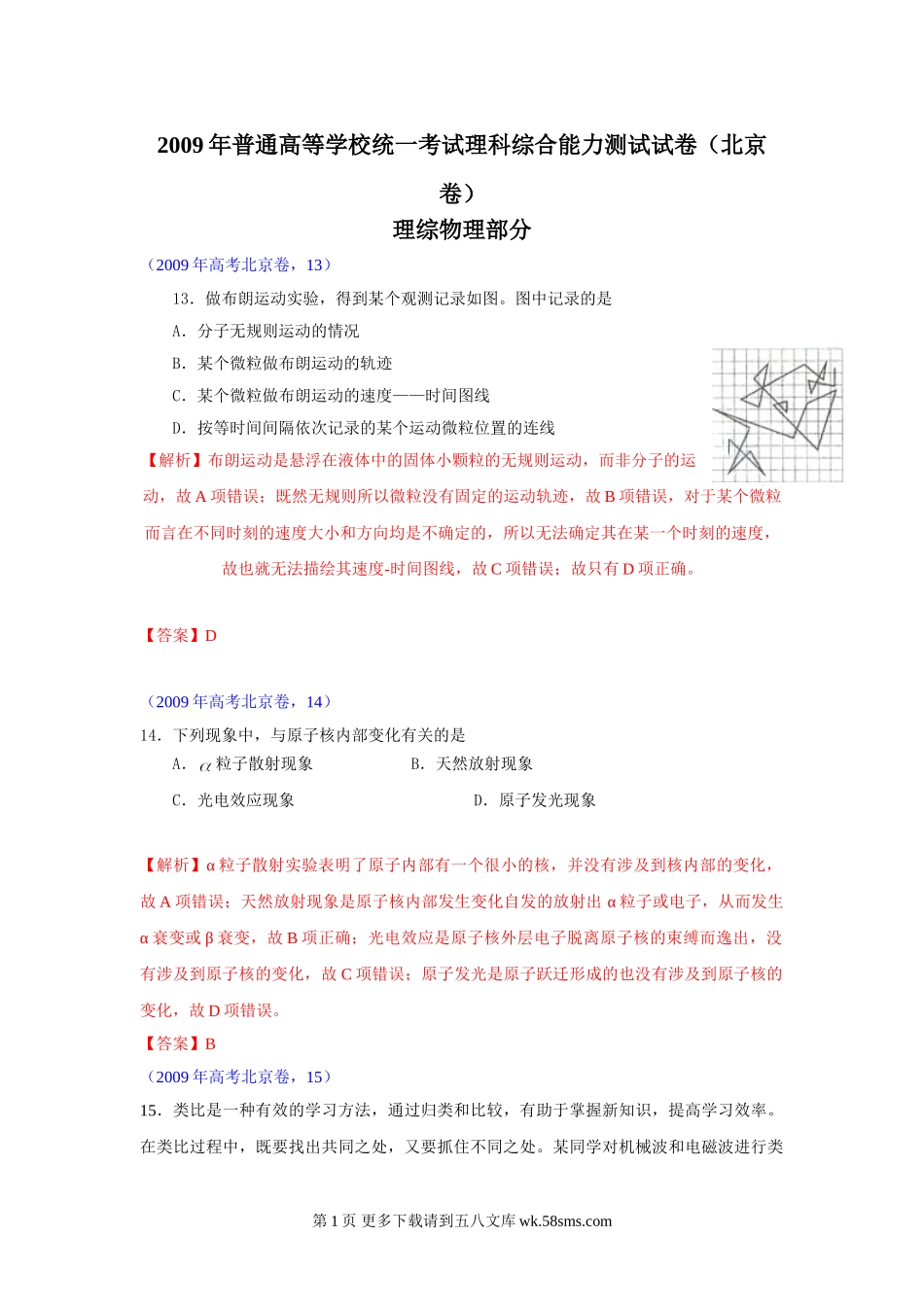 2009年普通高等学校统一考试理科综合能力测试试卷(北京卷)理综物理部分(2009年高考北京卷,13)13.做布朗运动实验,得到某个观测记录如图。图中记录的是A.分子无规则运动的情况B.某个微粒做布朗运动的轨迹C...