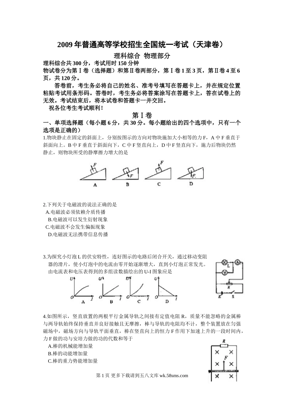 2009年普通高等学校招生全国统一考试(天津卷)理科综合物理部分理科综合共300分,考试用时150分钟物试卷分为第Ⅰ卷(选择题)和第Ⅱ卷两部分,第Ⅰ卷1至3页,第Ⅱ卷4至6页,共120分。答卷前,考生务必将自己的姓...