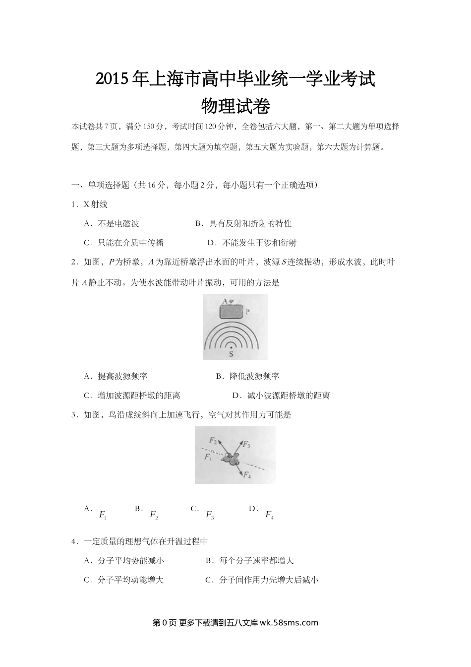 2015年上海市高中毕业统一学业考试物理试卷本试卷共7页,满分150分,考试时间120分钟,全卷包括六大题,第一、第二大题为单项选择题,第三大题为多项选择题,第四大题为填空题,第五大题为实验题,第六大题为计算...