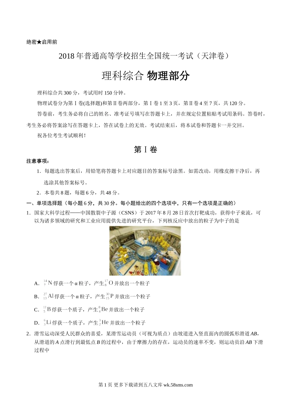 绝密★启用前2018年普通高等学校招生全国统一考试(天津卷)理科综合物理部分理科综合共300分,考试用时150分钟。物理试卷分为第Ⅰ卷(选择题)和第Ⅱ卷两部分,第Ⅰ卷1至3页,第Ⅱ卷4至7页,共120分。答卷前,考生...