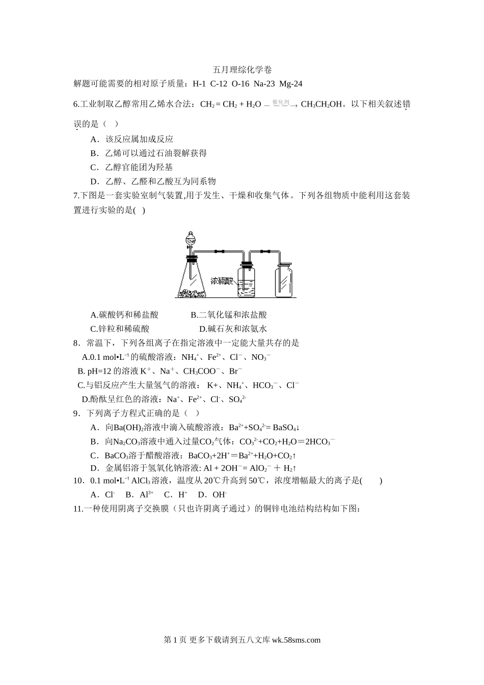 五月理综化学卷解题可能需要的相对原子质量:H-1C-12O-16Na-23Mg-246.工业制取乙醇常用乙烯水合法:CH2=CH2+H2OCH3CH2OH。以下相关叙述错误的是()A.该反应属加成反应B.乙烯可以通过石油裂解获得C.乙醇官能团...