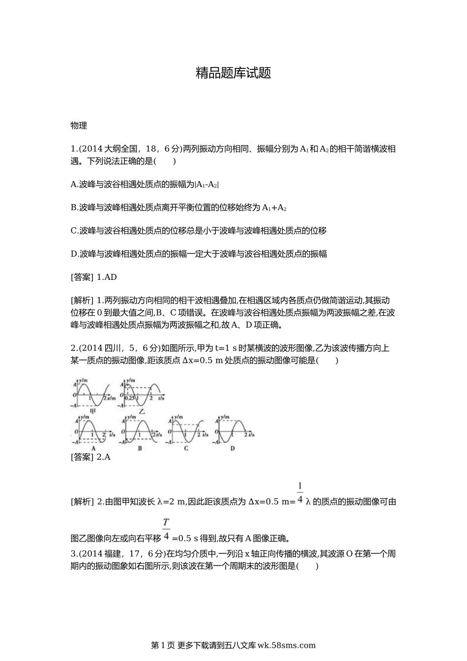 精品题库试题物理1.(2014大纲全国,18,6分)两列振动方向相同、振幅分别为A1和A2的相干简谐横波相遇。下列说法正确的是()A.波峰与波谷相遇处质点的振幅为|A1-A2|B.波峰与波峰相遇处质点离开平衡位置的位移始终为A...