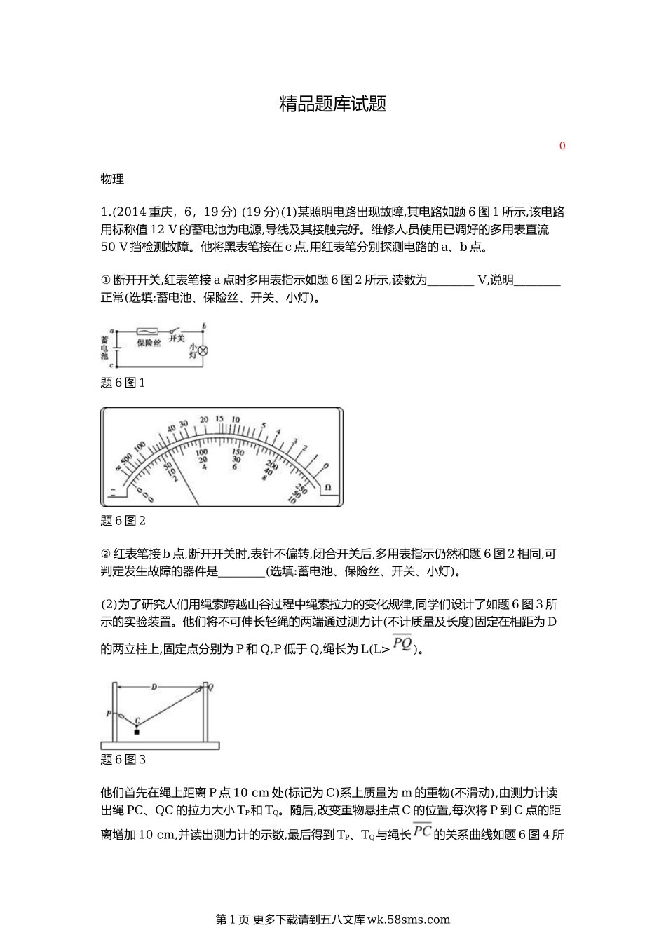 精品题库试题0物理1.(2014重庆,6,19分)(19分)(1)某照明电路出现故障,其电路如题6图1所示,该电路用标称值12V的蓄电池为电源,导线及其接触完好。维修人员使用已调好的多用表直流50V挡检测故障。他将黑表笔接在c点...