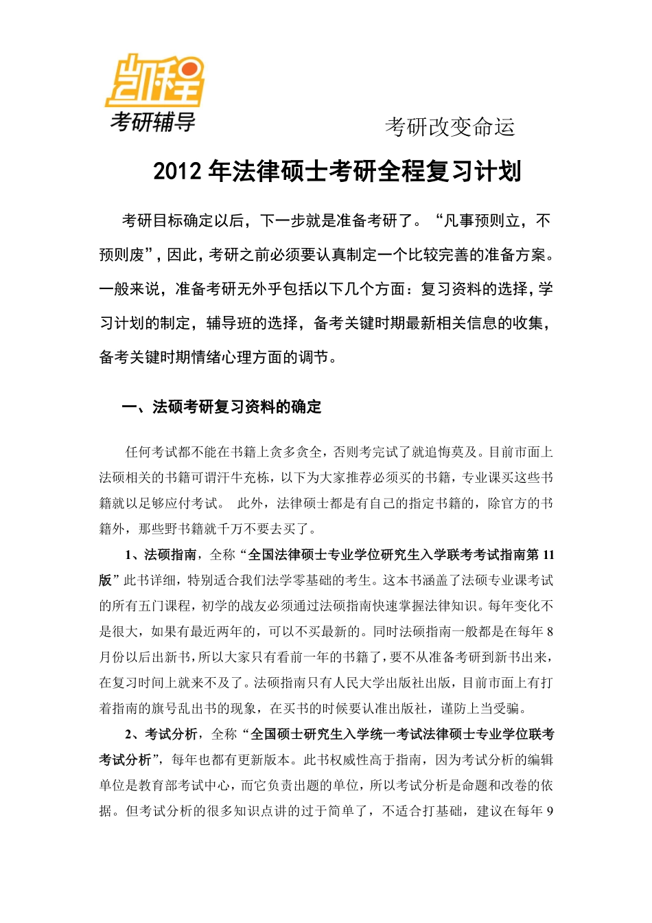 考研改变命运2012年法律硕士考研全程复习计划考研目标确定以后,下一步就是准备考研了。“凡事预则立,不预则废”,因此,考研之前必须要认真制定一个比较完善的准备方案。一般来说,准备考研无外乎包括以下几个...