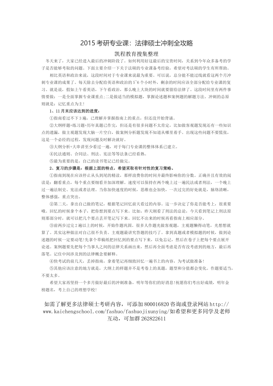 2015考研专业课:法律硕士冲刺全攻略凯程教育搜集整理冬天来了,大家已经进入最后的冲刺阶段了。如何利用好这最后的宝贵时间,关系到今年众多备考的学子是否能够考取的问题。下面主要介绍一下关于法硕的专业课备...