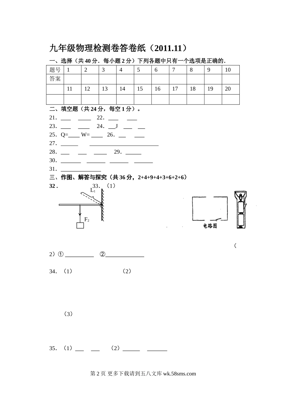 九年级物理检测卷答案(2011.11)一、选择(共40分.每小题2分)下列各题中只有一个选项是正确的.题号12345678910答案DDCACCDADB11121314151617181920BBCBCCCBBA二、填空题(共24分,每空1分)。21.③大于22.1...