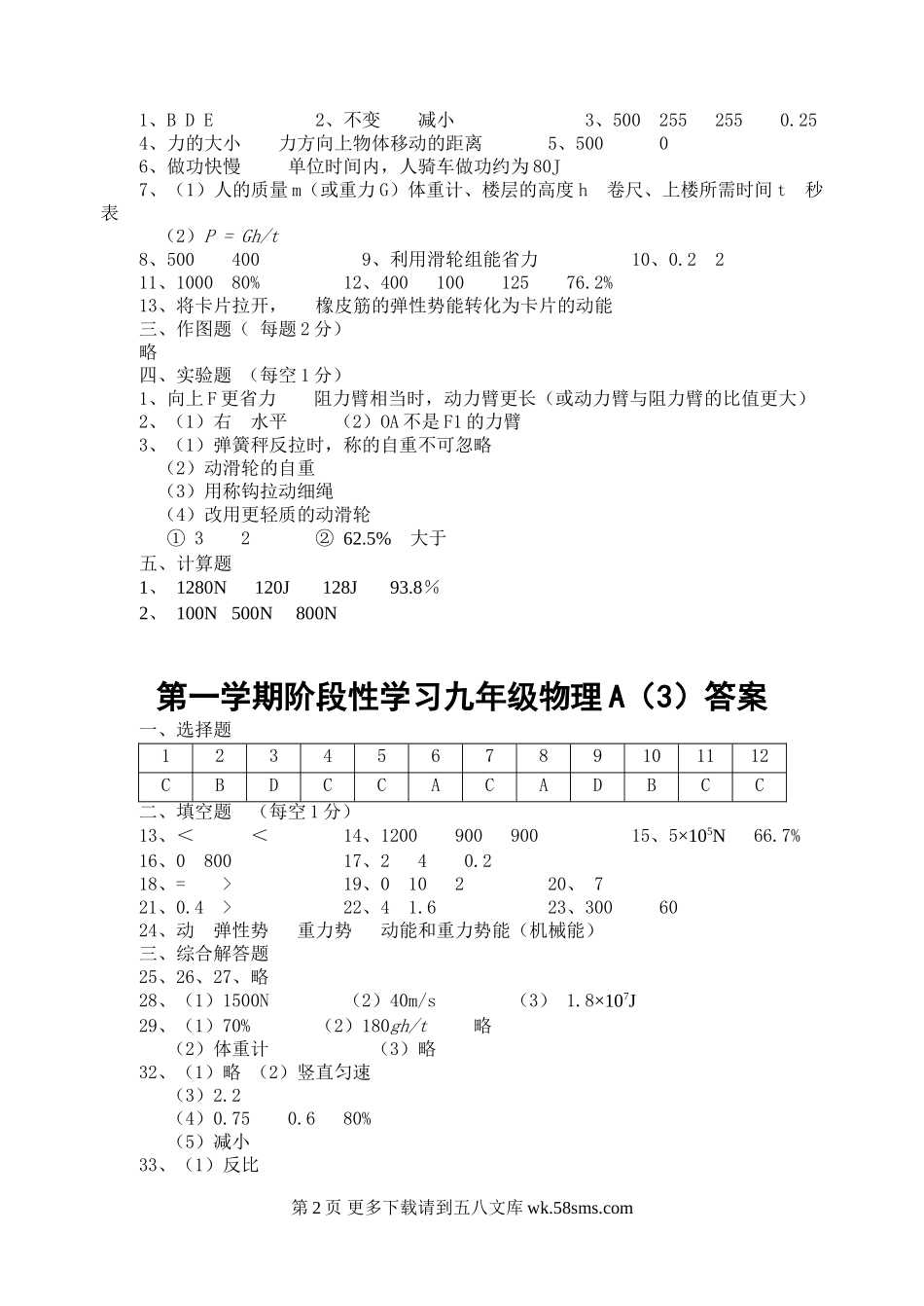 第一学期阶段性学习九年级物理A(1)答案一、选择1-7CCBCDAD8-14BAABACD二、填空15、做功快慢单位时间内做2J的功16、费力省距离定等臂改变力的方向17、杠杆轮轴18、小强力臂较长19、动能与重力势能相互转换由于摩...