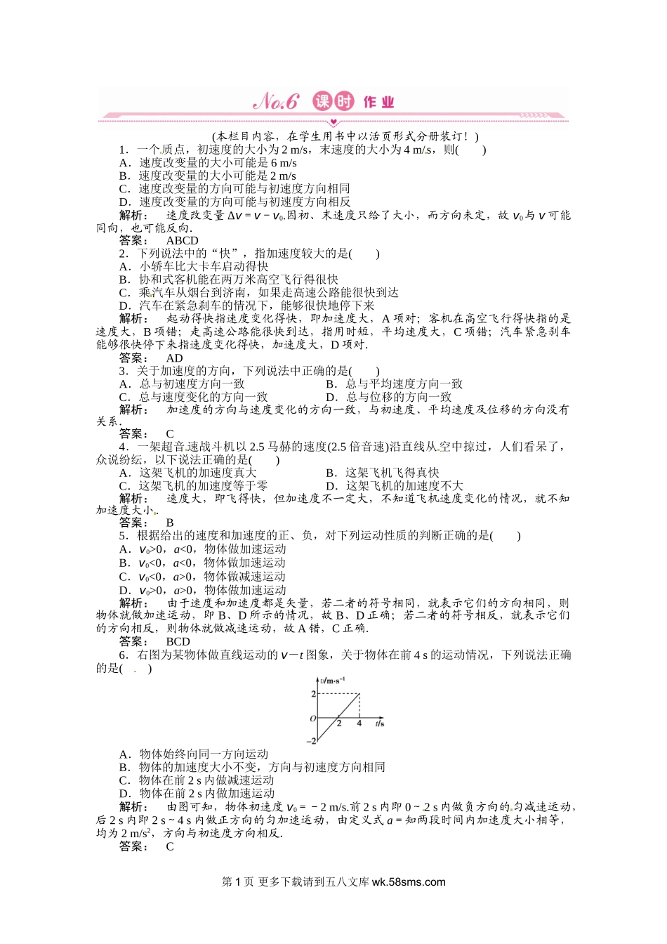 (本栏目内容,在学生用书中以活页形式分册装订!)1.一个质点,初速度的大小为2m/s,末速度的大小为4m/s,则()A.速度改变量的大小可能是6m/sB.速度改变量的大小可能是2m/sC.速度改变量的方向可能与初速度方向...