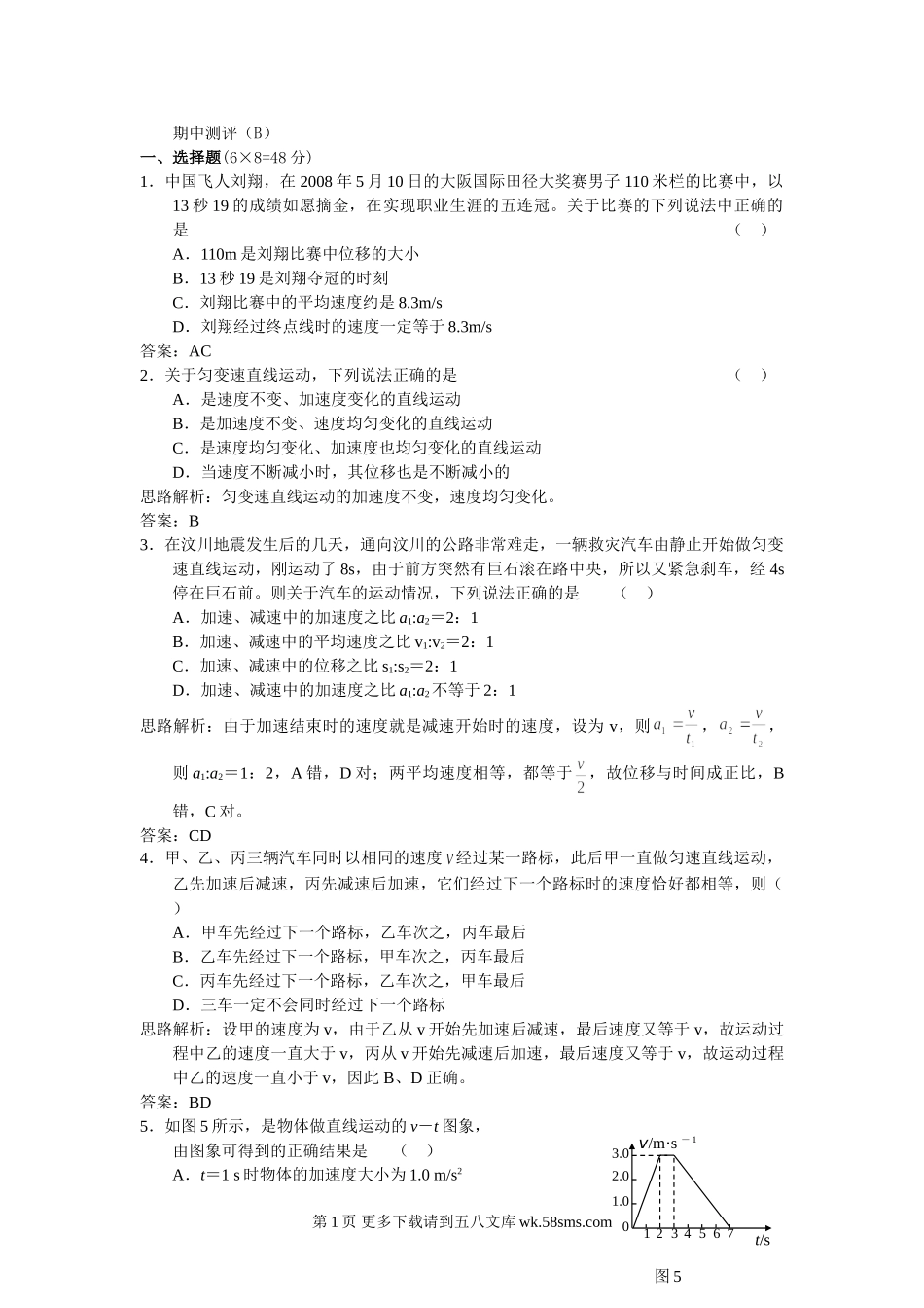 123456701.02.03.0v/m·s-1t/s图5期中测评(B)一、选择题(6×8=48分)1.中国飞人刘翔,在2008年5月10日的大阪国际田径大奖赛男子110米栏的比赛中,以13秒19的成绩如愿摘金,在实现职业生涯的五连冠。关于比赛的...