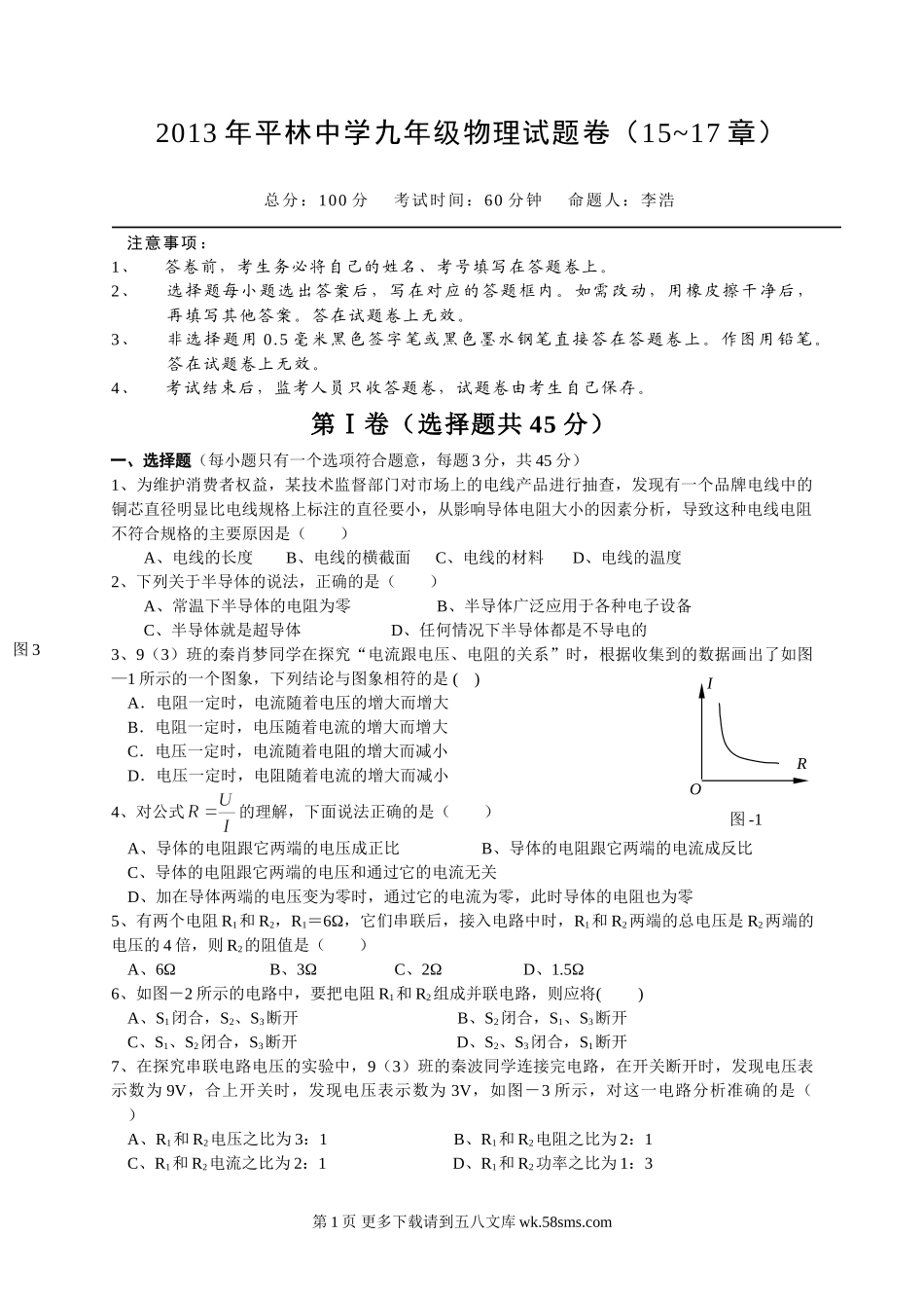 2013年平林中学九年级物理试题卷(15~17章)总分:100分考试时间:60分钟命题人:李浩注意事项:1、答卷前,考生务必将自己的姓名、考号填写在答题卷上。2、选择题每小题选出答案后,写在对应的答题框内。如需改...