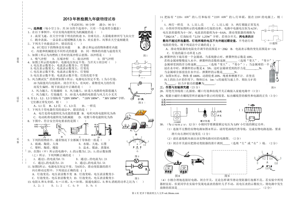 图2图515题图图92013年秋检测九年级物理试卷(考试时间:90分钟满分:90分)一、选择题(每小空2分,共30分四个选项中,只有一个选项符合题意)1、在以下事例中,可以实现内能转化为机械能的是()A.流星飞逝,在...
