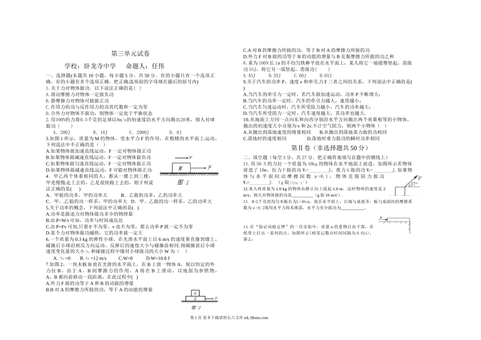 第三单元试卷学校:卧龙寺中学命题人:任伟一、选择题(本题共10小题,每小题5分,共50分。有的小题只有一个选项正确,有的小题有多个选项正确,把正确选项前的字母填在题后的括号内)1.关于力对物体做功.以下说法...