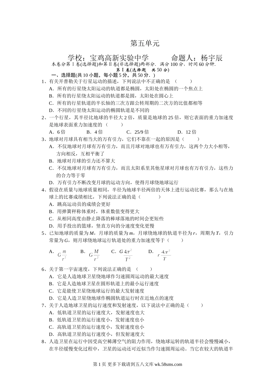 第五单元学校:宝鸡高新实验中学命题人:杨宇辰本卷分第Ⅰ卷(选择题)和第Ⅱ卷(非选择题)两部分.满分100分,时间60分钟.第Ⅰ卷(选择题共50分)一、选择题(共10小题,每小题5分,共50分.)1、有关开普勒关于行星运...