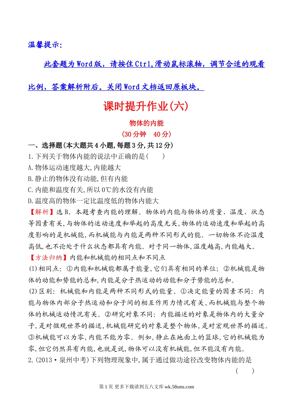 温馨提示:此套题为Word版,请按住Ctrl,滑动鼠标滚轴,调节合适的观看比例,答案解析附后。关闭Word文档返回原板块。课时提升作业(六)物体的内能(30分钟40分)一、选择题(本大题共4小题,每题3分,共12分)1.下列关于...