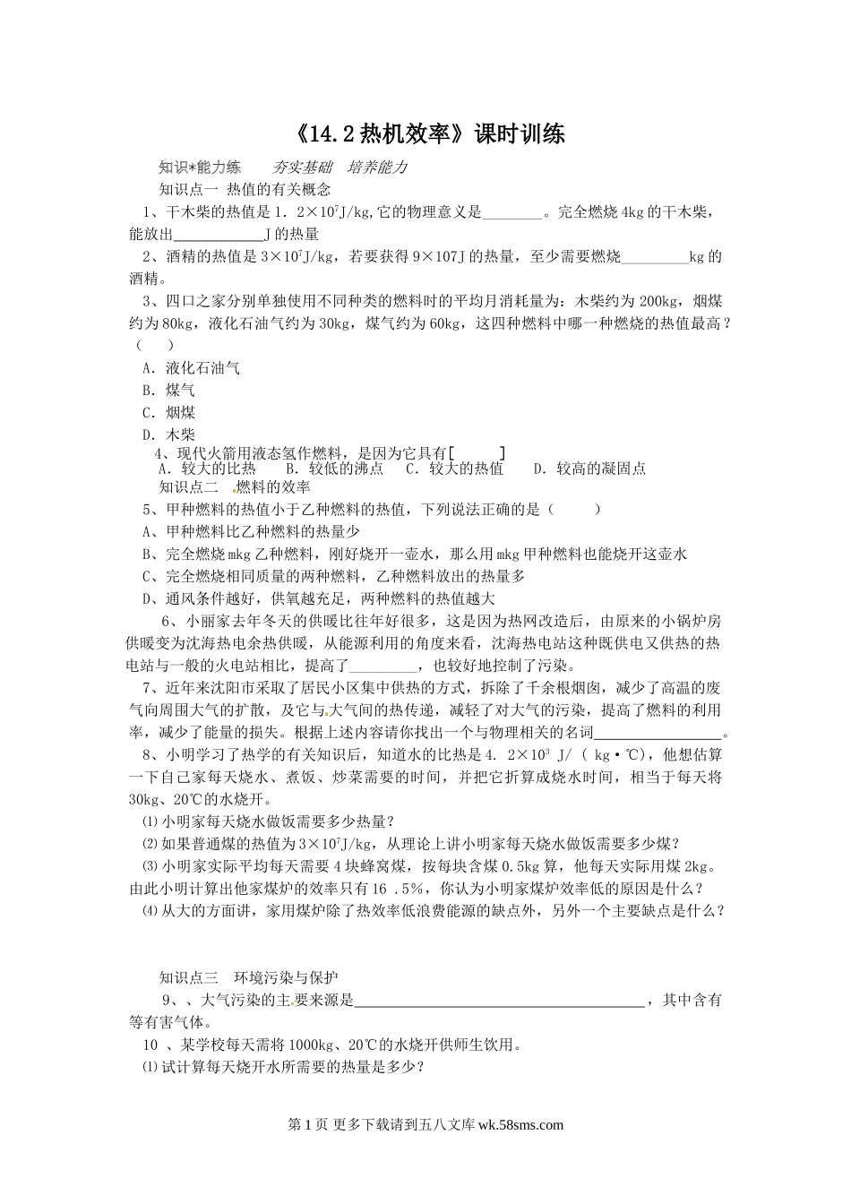《14.2热机效率》课时训练知识*能力练夯实基础培养能力知识点一热值的有关概念1、干木柴的热值是1.2×107J/kg,它的物理意义是________。完全燃烧4kg的干木柴,能放出J的热量2、酒精的热值是3×107J/kg,若要获得...