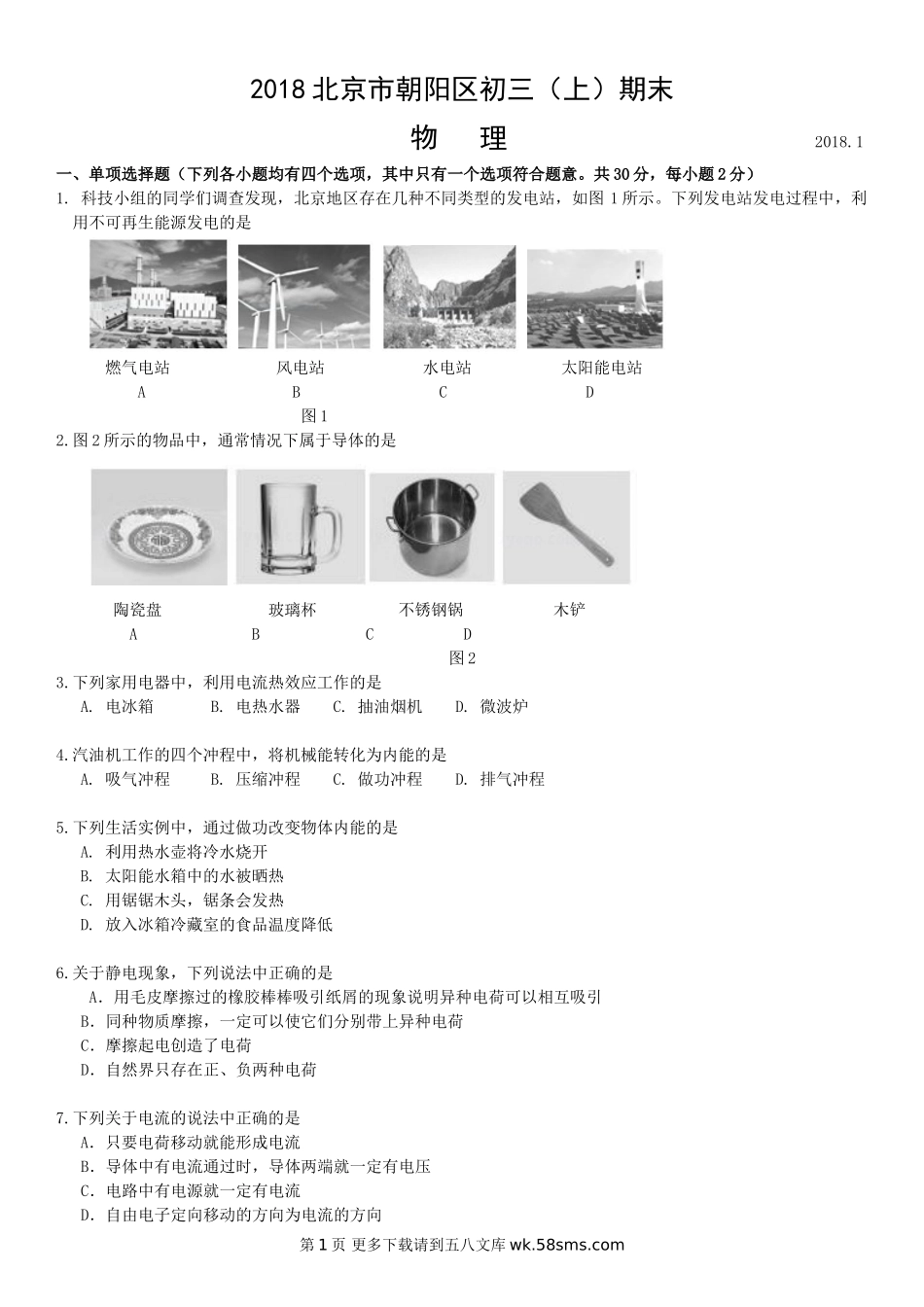 2018北京市朝阳区初三(上)期末物理2018.1一、单项选择题(下列各小题均有四个选项,其中只有一个选项符合题意。共30分,每小题2分)1.科技小组的同学们调查发现,北京地区存在几种不同类型的发电站,如图1所示...