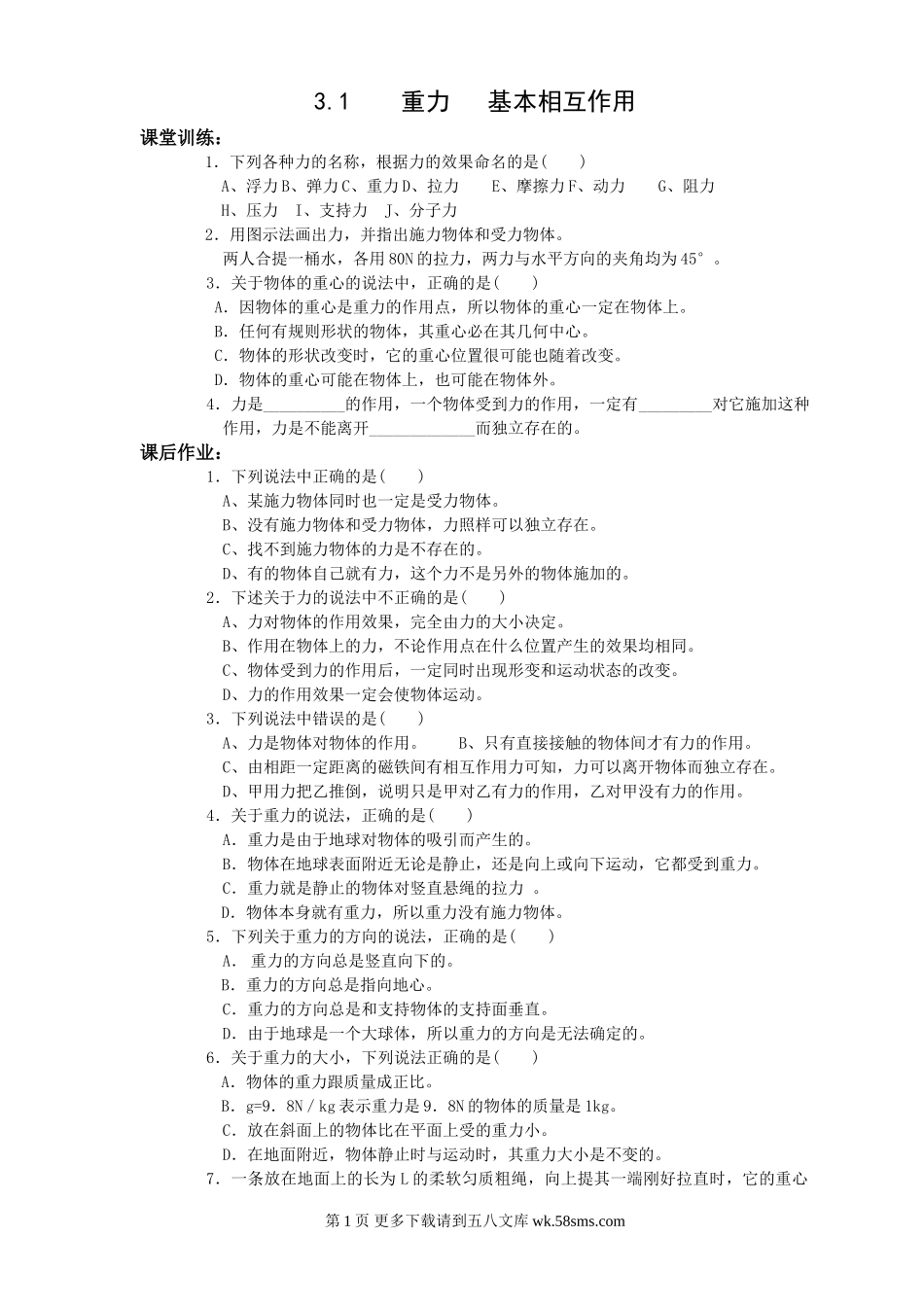 3.1重力基本相互作用课堂训练:1.下列各种力的名称,根据力的效果命名的是()A、浮力B、弹力C、重力D、拉力E、摩擦力F、动力G、阻力H、压力I、支持力J、分子力2.用图示法画出力,并指出施力物体和受力物体。两人...