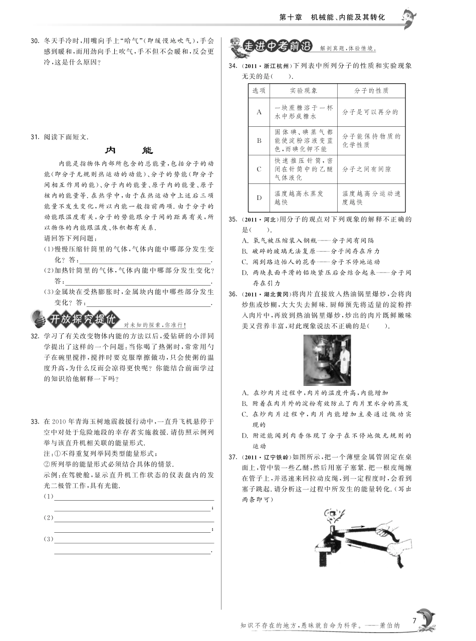 第十章机械能、内能及其转化知识是产生对人类自由的热爱和原则的惟一源泉。———韦伯斯特5二、内能1.能说出内能、热量的概念,能简述温度和内能、热量的关系.2.通过探究找到改变物体内能的两种方法———做功和热...