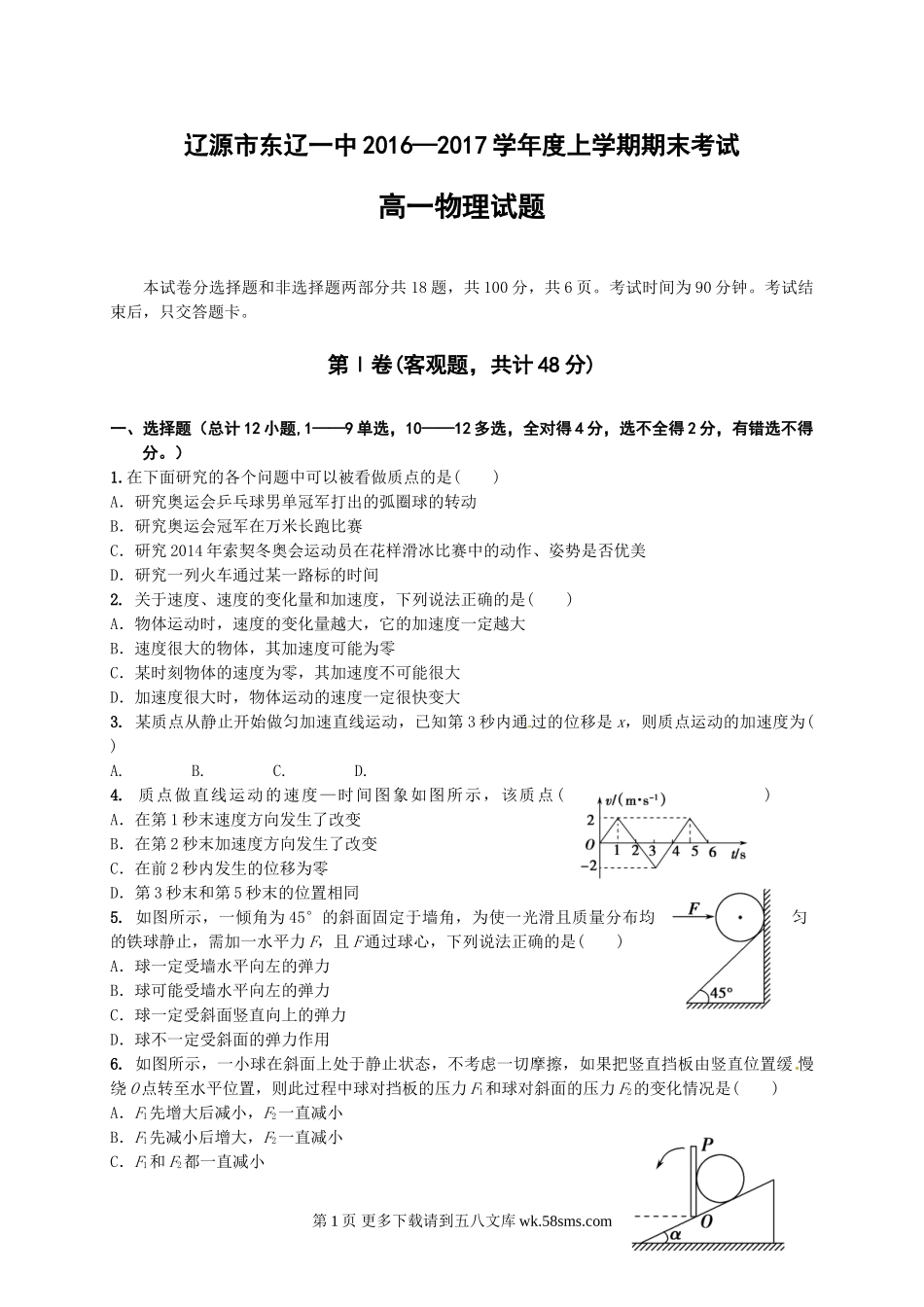 辽源市东辽一中2016—2017学年度上学期期末考试高一物理试题本试卷分选择题和非选择题两部分共18题,共100分,共6页。考试时间为90分钟。考试结束后,只交答题卡。第Ⅰ卷(客观题,共计48分)一、选择题(总计12小...