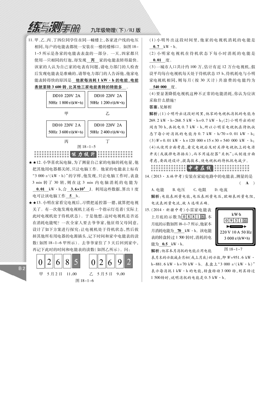 初三物理九年级物理2015年九年级物理第十八章 电功率练习题及答案解析.pdf