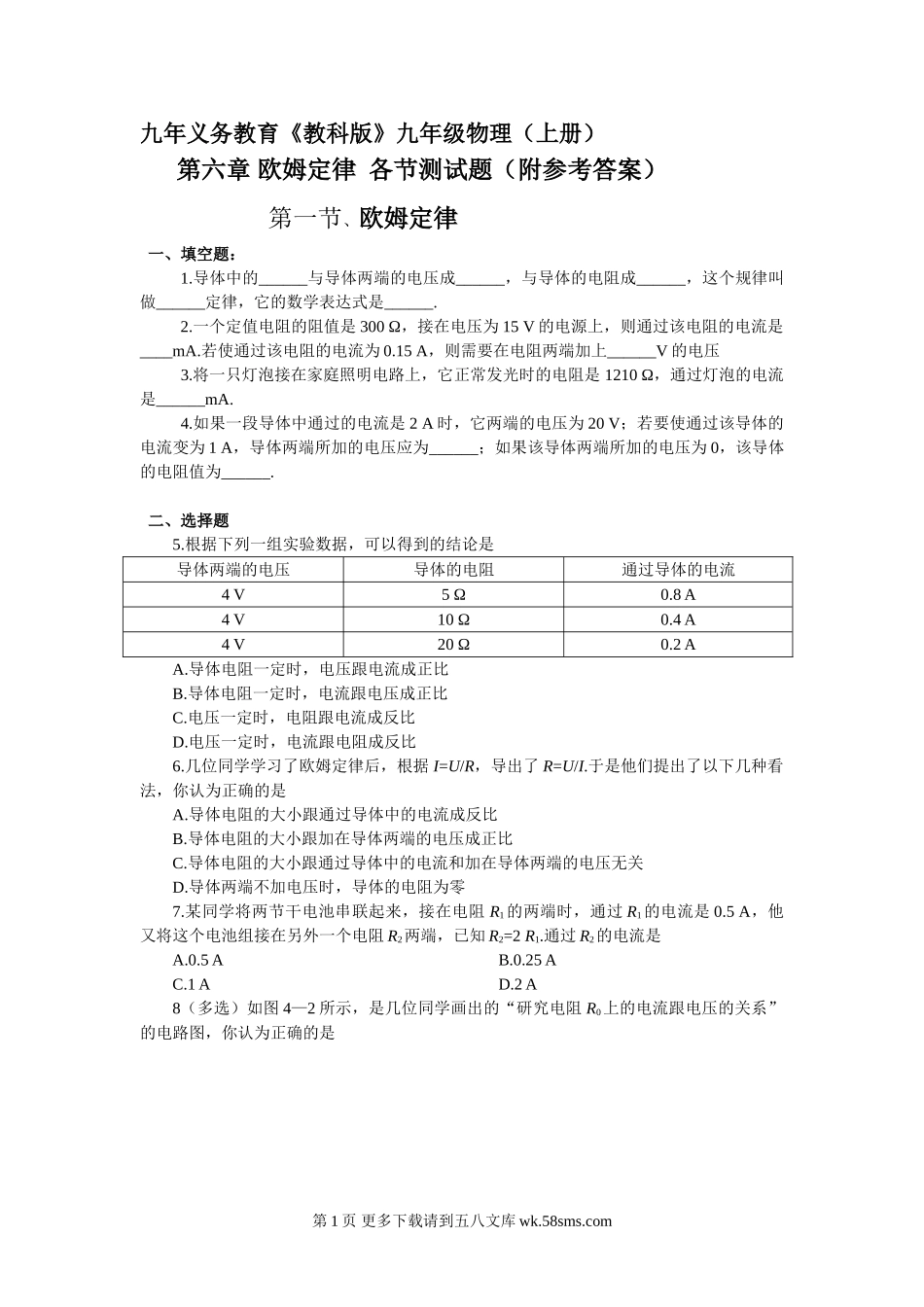 九年义务教育《教科版》九年级物理(上册)第六章欧姆定律各节测试题(附参考答案)第一节、欧姆定律一、填空题:1.导体中的______与导体两端的电压成______,与导体的电阻成______,这个规律叫做______定律,它...