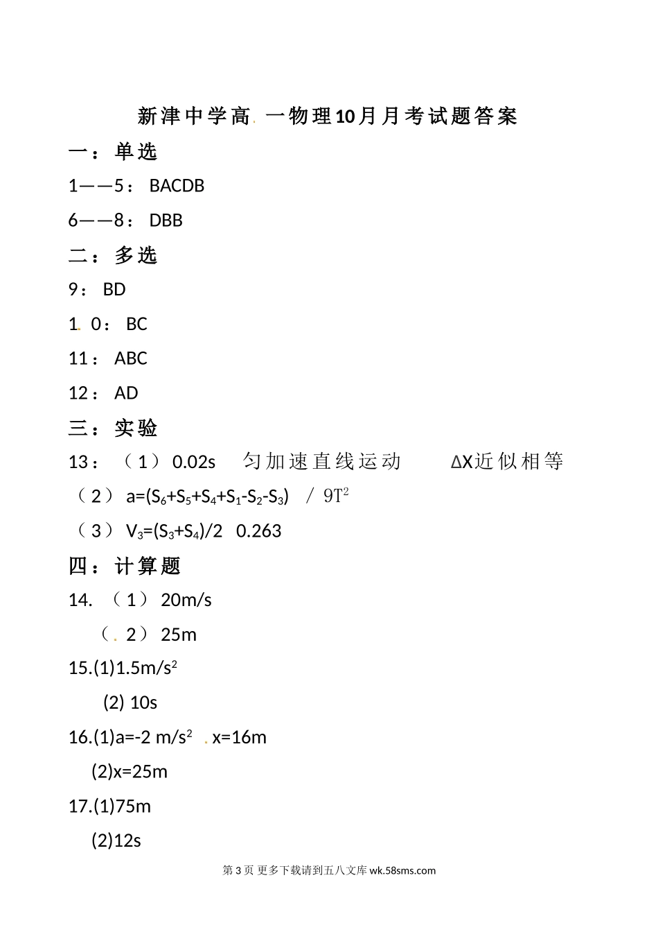 高一物理四川省新津中学高一10月月考物理试题及答案.doc_第3页