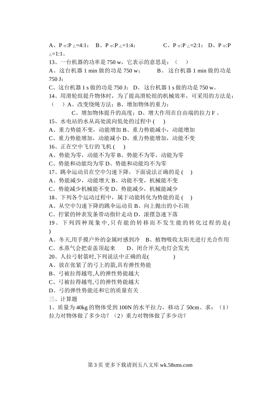 初三物理九年级物理第十四章 功练习题.doc_第3页