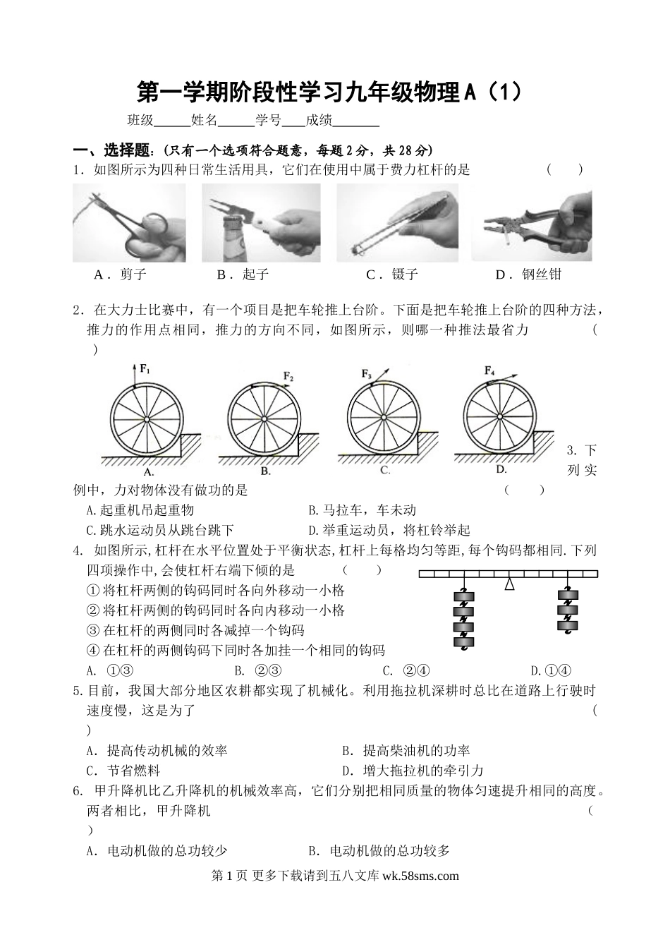 第一学期阶段性学习九年级物理A(1)班级姓名学号成绩一、选择题:(只有一个选项符合题意,每题2分,共28分)1.如图所示为四种日常生活用具,它们在使用中属于费力杠杆的是()2.在大力士比赛中,有一个项目是把车...