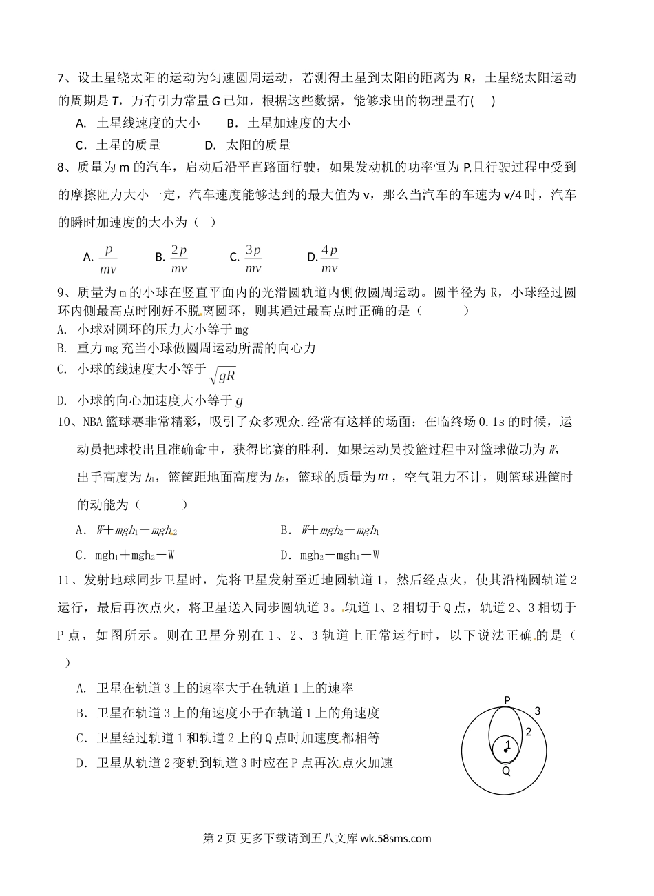 高一物理微山一中高一下学期物理期末模拟试题及答案.doc_第2页