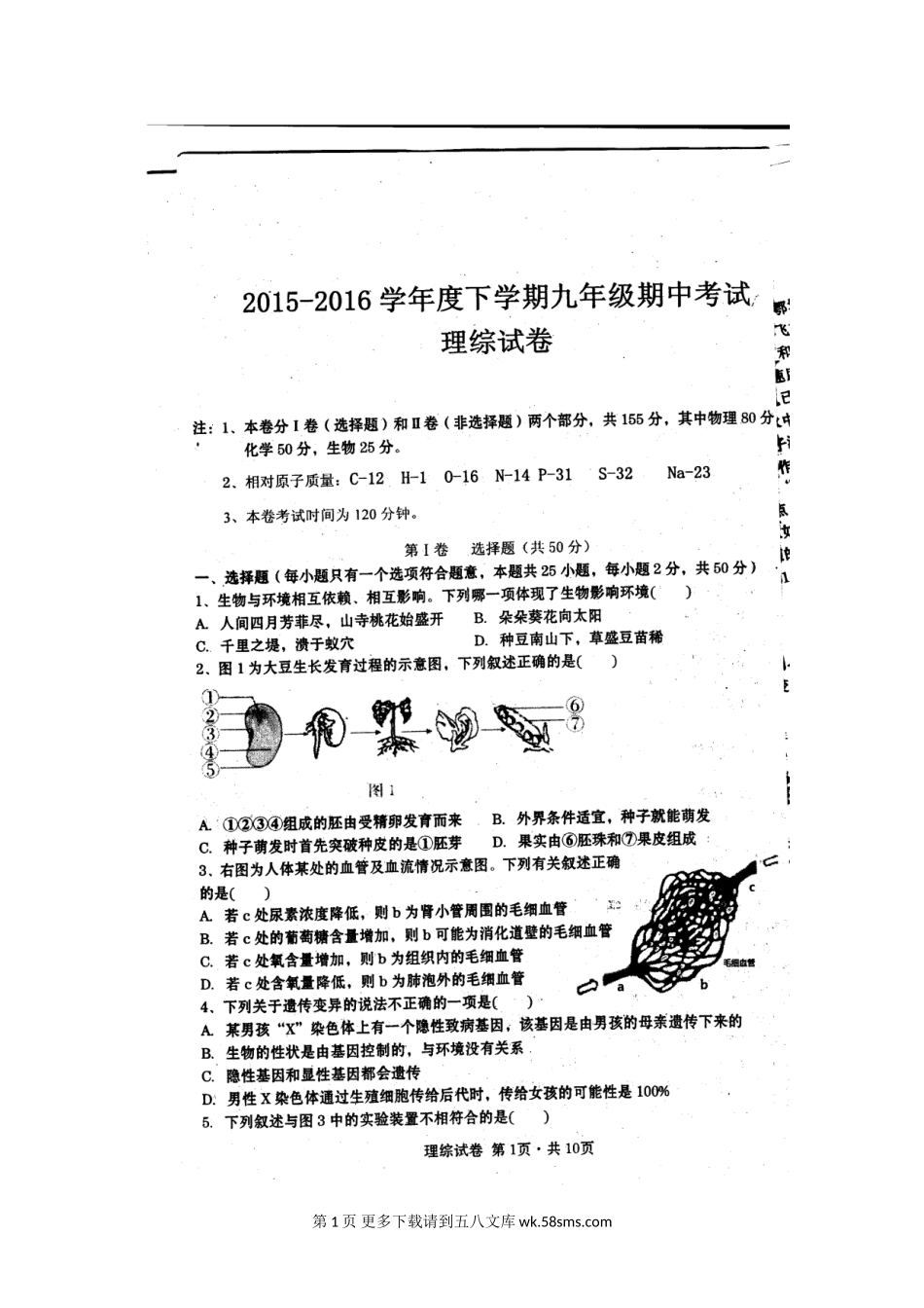 初三物理九年级物理鄂州市鄂城区2016九年级下学期期中理科综合试题及答案.doc_第1页
