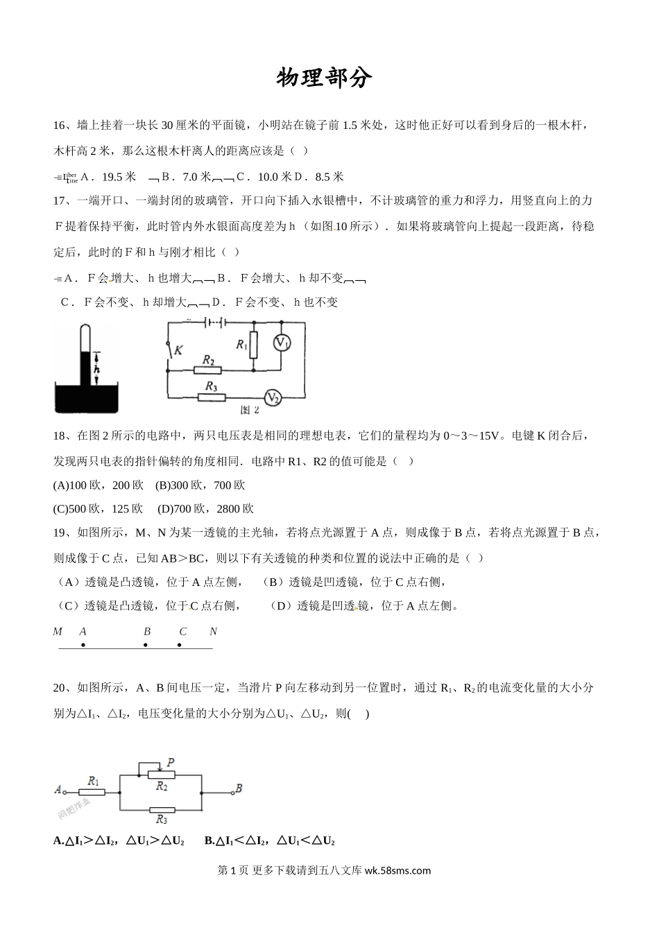 物理部分16、墙上挂着一块长30厘米的平面镜,小明站在镜子前1.5米处,这时他正好可以看到身后的一根木杆,木杆高2米,那么这根木杆离人的距离应该是()A.19.5米B.7.0米C.10.0米D.8.5米17、一...