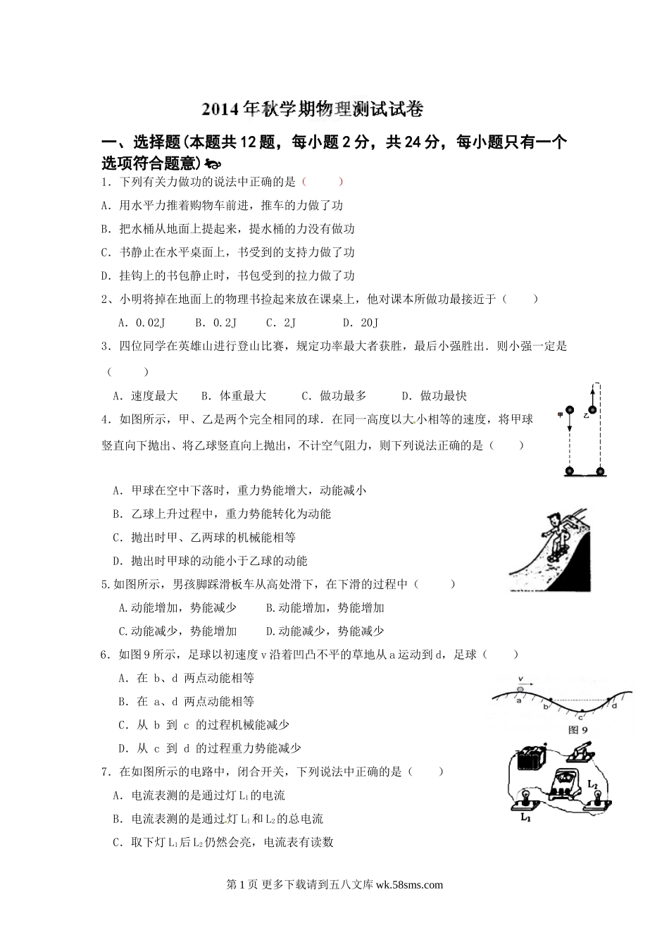 一、选择题(本题共12题,每小题2分,共24分,每小题只有一个选项符合题意)1.下列有关力做功的说法中正确的是()[来A.用水平力推着购物车前进,推车的力做了功B.把水桶从地面上提起来,提水桶的力没有做功C...