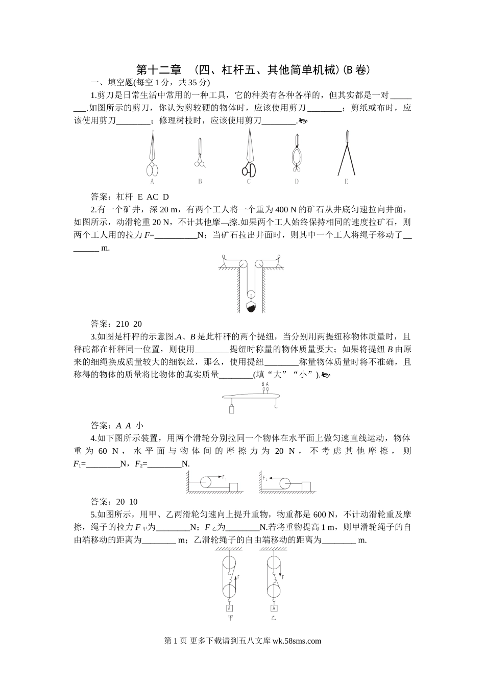 第十二章(四、杠杆五、其他简单机械)(B卷)一、填空题(每空1分,共35分)1.剪刀是日常生活中常用的一种工具,它的种类有各种各样的,但其实都是一对________.如图所示的剪刀,你认为剪较硬的物体时,应该使用剪刀__...