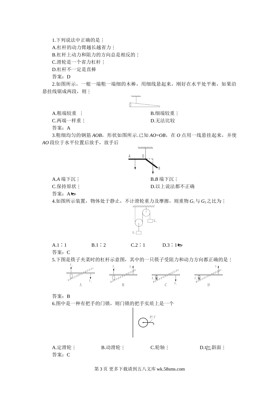 初三物理九年级物理杠杆和简单机械 单元测试题 试题 2.doc_第3页