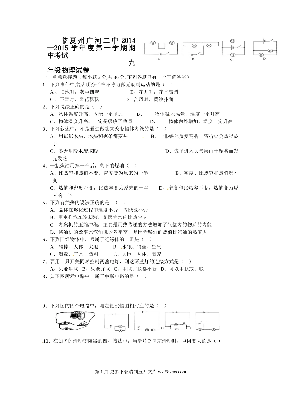 临夏州广河二中2014—2015学年度第一学期期中考试九年级物理试卷一、单项选择题(每小题3分,共36分.下列各题只有一个正确答案)1、下列事件中,能表明分子在不停地做无规则运动的是()A、扫地时,灰尘四起B、花开...