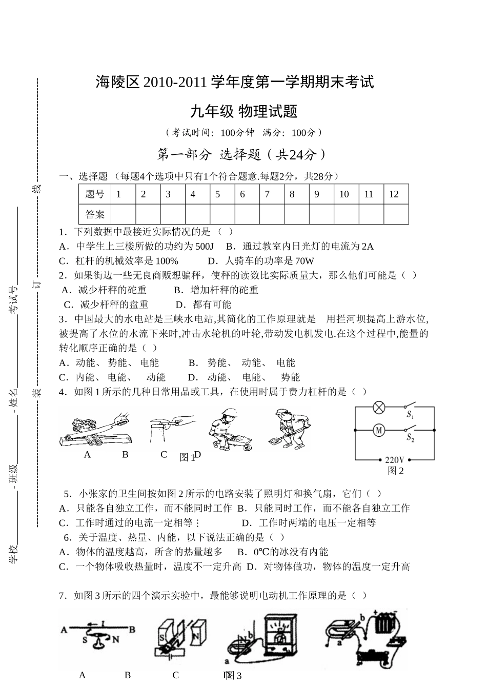 初三物理九年级物理海陵区第一学期九年级物理试卷及答案.doc_第3页