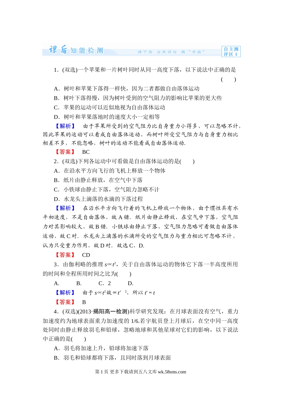 1.(双选)一个苹果和一片树叶同时从同一高度下落,以下说法中正确的是()A.树叶和苹果下落得一样快,因为二者都做自由落体运动B.树叶下落得慢,因为树叶受到的空气阻力的影响比苹果的更大些C.苹果的运动可以近...
