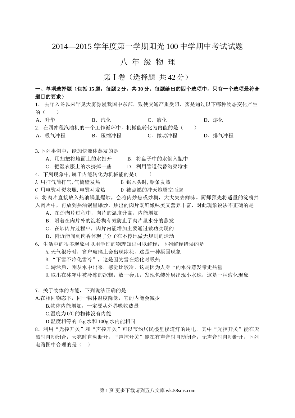 2014—2015学年度第一学期阳光100中学期中考试试题八年级物理第Ⅰ卷(选择题共42分)一、单项选择题(包括15题,每题2分,共30分。每题给出的四个选项中,只有一个选项最符合题目的要求)1.去年入冬以来罕见大雾...