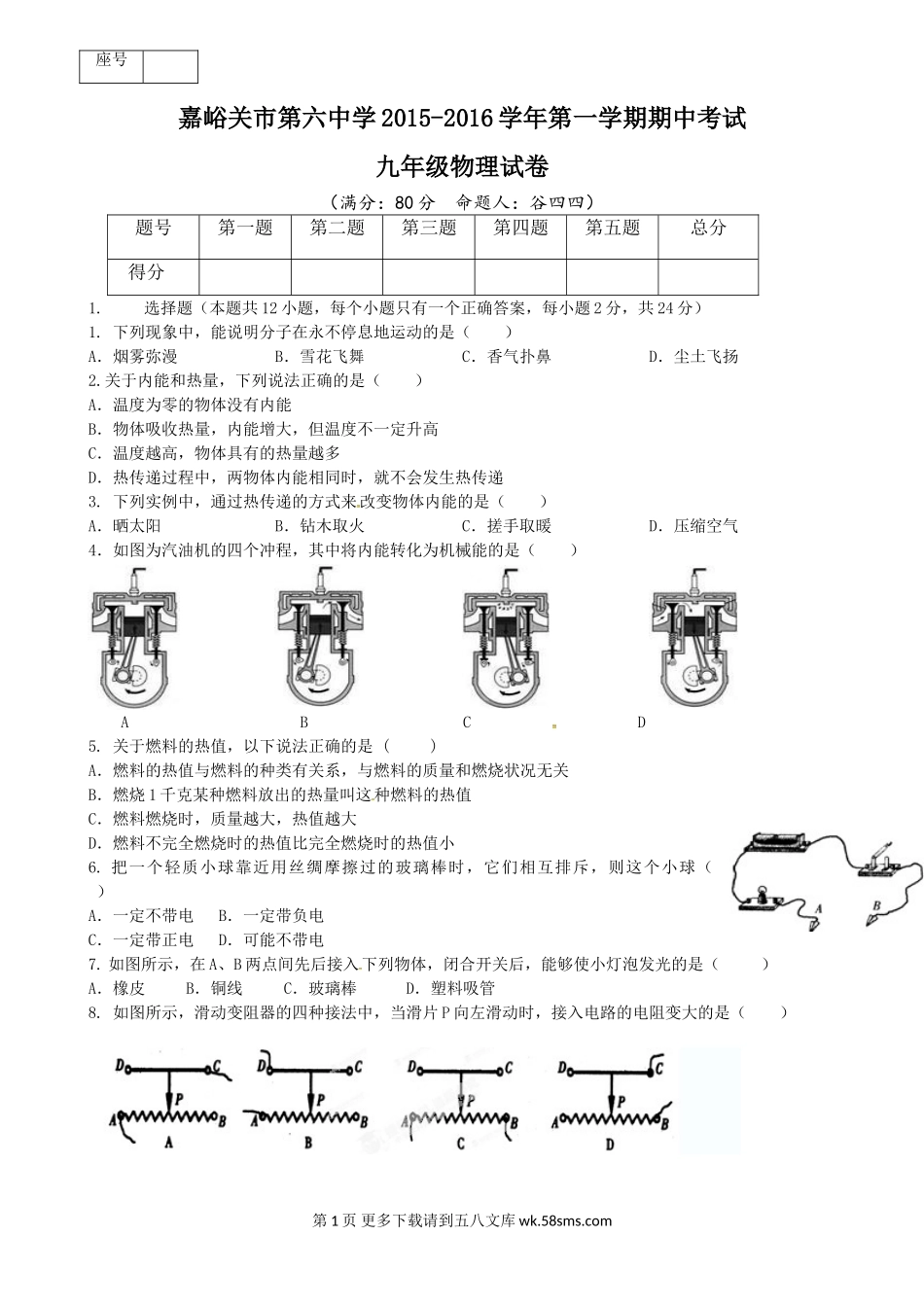 嘉峪关市第六中学2015-2016学年第一学期期中考试九年级物理试卷(满分:80分命题人:谷四四)题号第一题第二题第三题第四题第五题总分得分x_k_b_11.选择题(本题共12小题,每个小题只有一个正确答案,每小题2分,...
