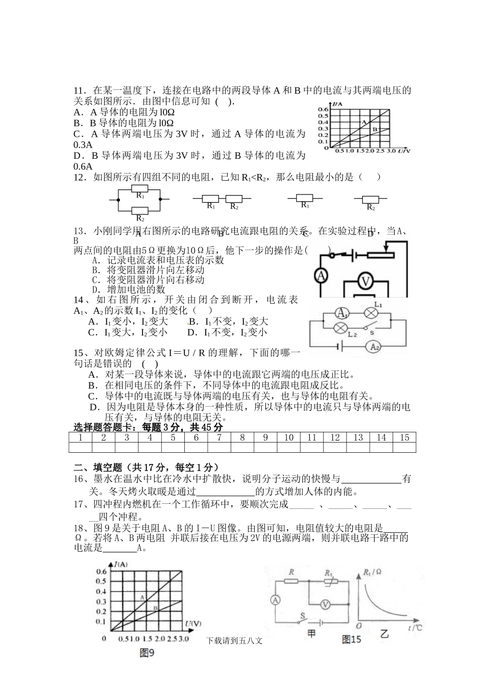 鹤山三中2014-2015学年度第一学期中段考初三试题物理一、选择题:(注意:将答案填在后面的答题表格。每题3分,共45分)1.关于温度、比热容、热量、内能,以下说法正确的是()A.一块0℃的冰没有内能,它的分子...