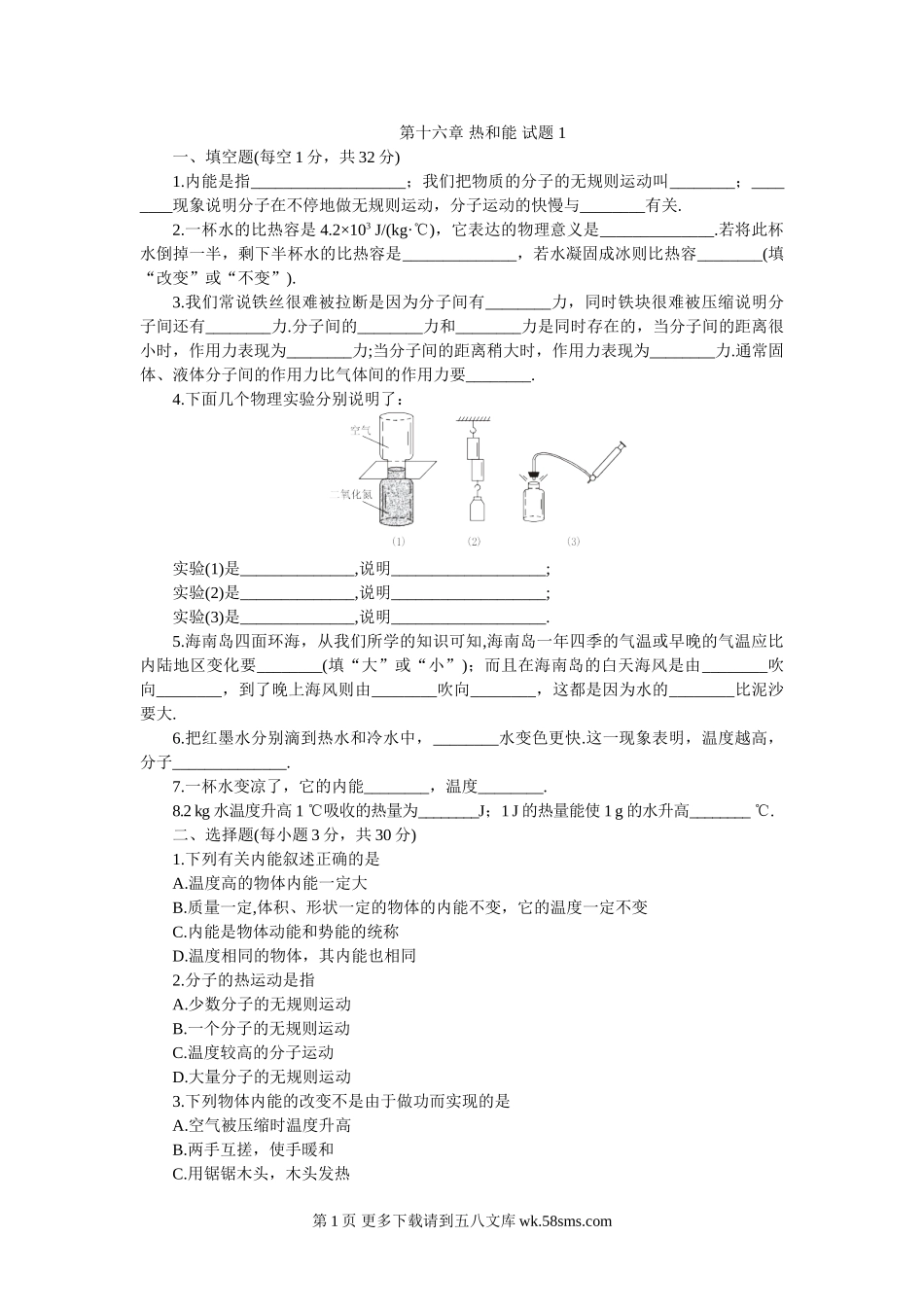 第十六章热和能试题1一、填空题(每空1分,共32分)1.内能是指___________________;我们把物质的分子的无规则运动叫________;________现象说明分子在不停地做无规则运动,分子运动的快慢与________有关.2.一杯水...