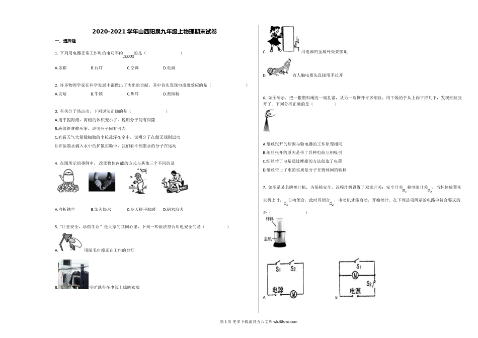 2020-2021学年山西阳泉九年级上物理期末试卷一、选择题1.下列用电器正常工作时的电功率约的是()A.冰箱B.台灯C.空调D.电扇2.许多物理学家在科学发展中都做出了杰出的贡献,其中首先发现电流磁效应的是()A.安培...
