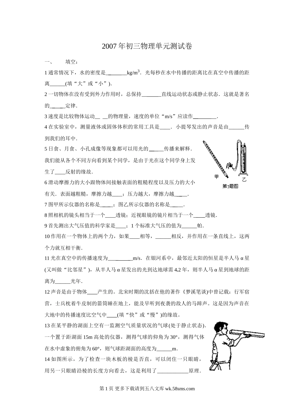 2007年初三物理单元测试卷一、填空:1通常情况下,水的密度是____kg/m3.光每秒在水中传播的距离比在真空中传播的距离______(填“大”或“小”).2一切物体在没有受到外力作用时,总保持___直线运动状态或静止状...