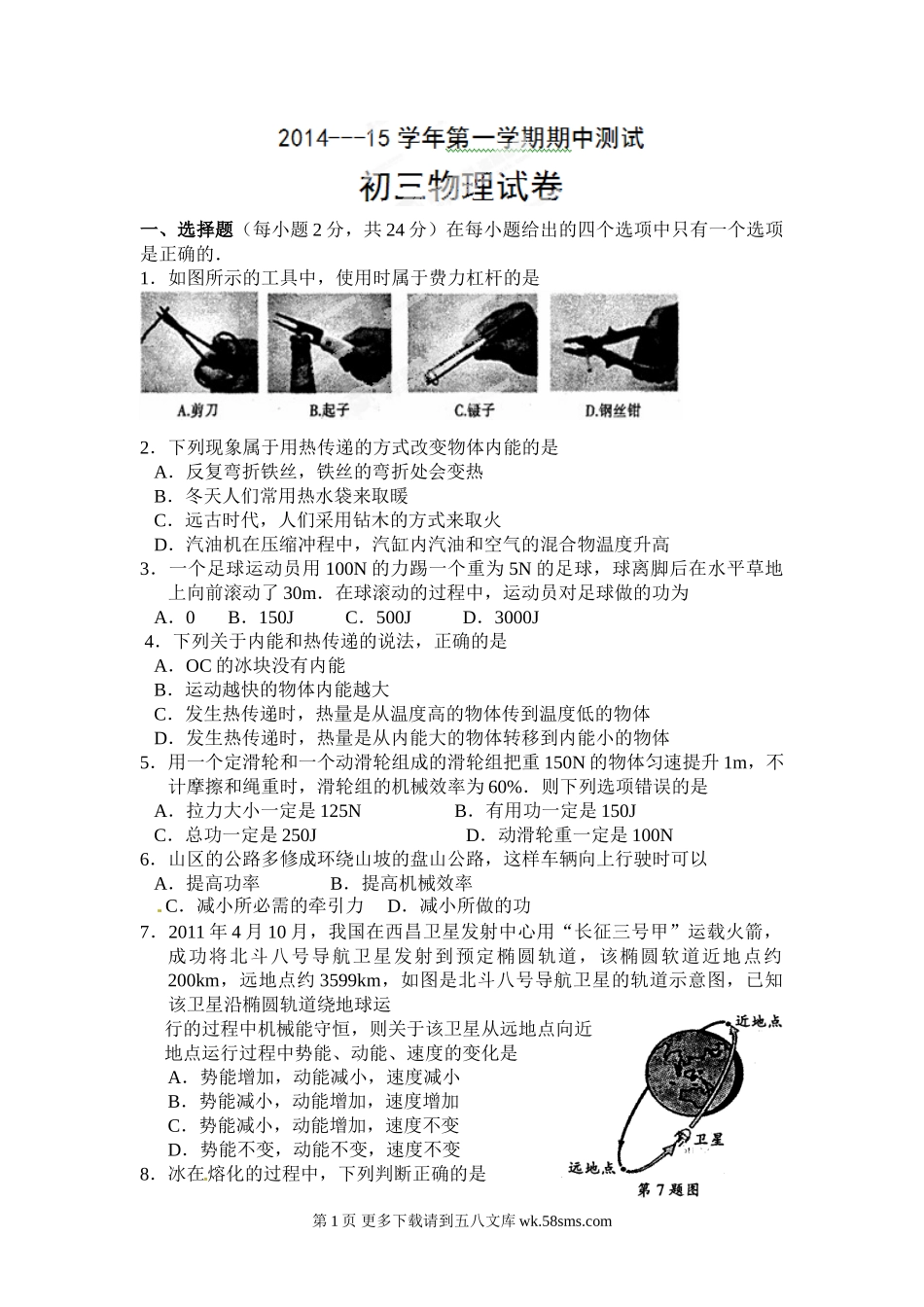 初三物理九年级物理吴江市青云中学2014-2015年第一学期初三期中物理试卷及答案.doc_第1页