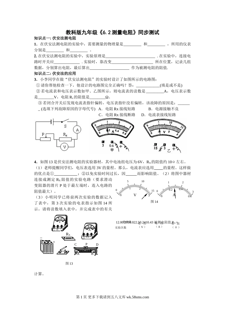教科版九年级《6.2测量电阻》同步测试知识点一:伏安法测电阻1.在伏安法测电阻的实验中,需要测量的物理量是和,所用的仪表分别是和。2.在伏安法测电阻的实验中,实验原理是.在实验中,连接电路时开关应.实验时,...