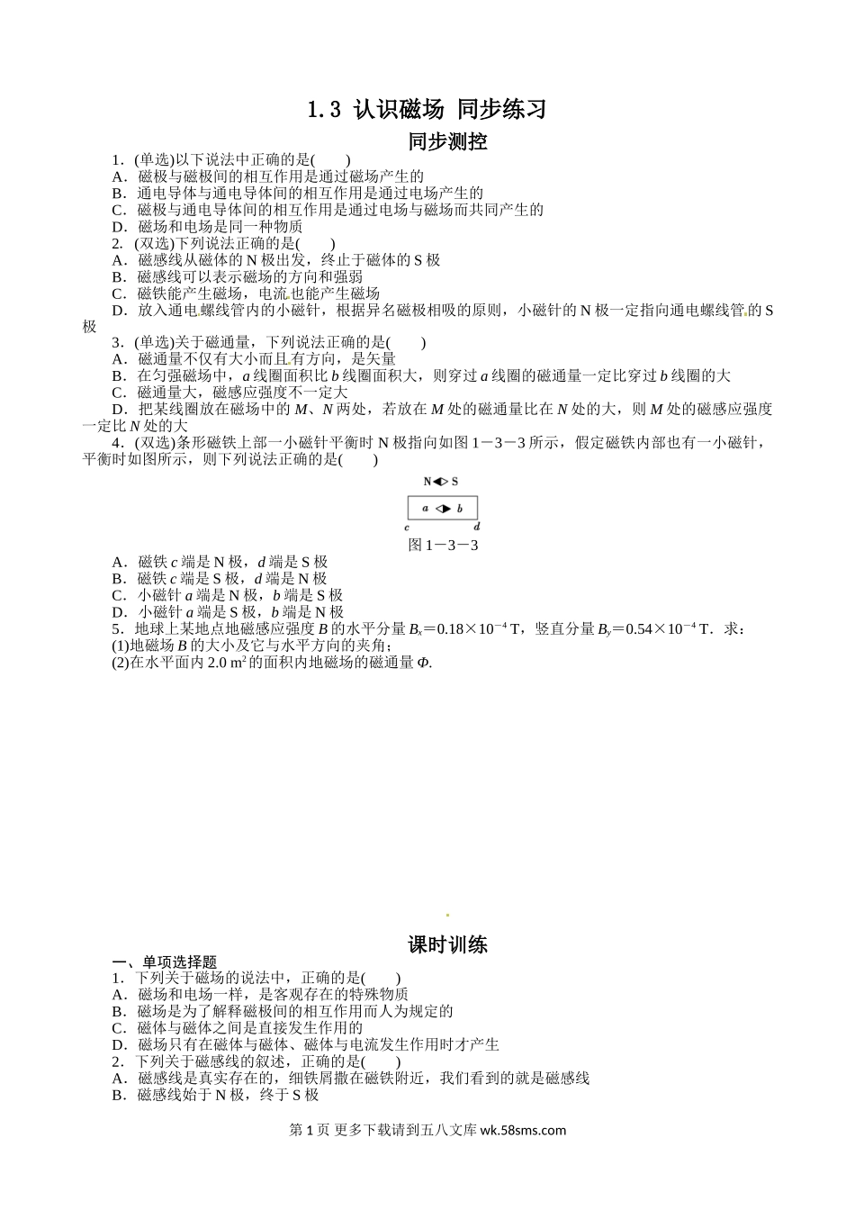 1.3认识磁场同步练习同步测控1.(单选)以下说法中正确的是()A.磁极与磁极间的相互作用是通过磁场产生的B.通电导体与通电导体间的相互作用是通过电场产生的C.磁极与通电导体间的相互作用是通过电场与磁场而共同...