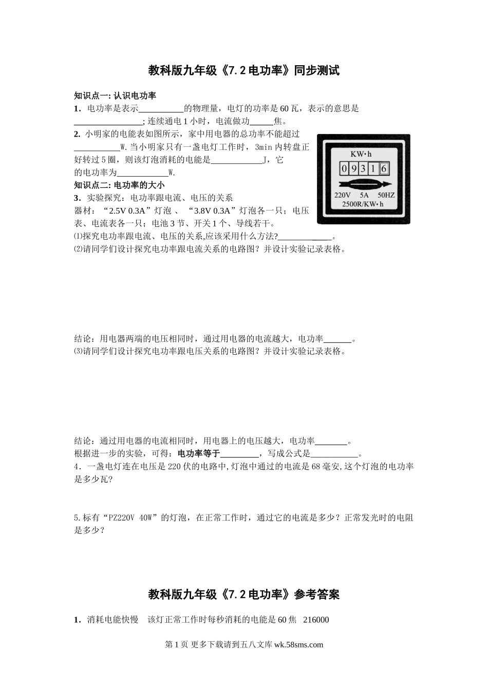 初三物理九年级物理物理九年级上教科版第七章第2节电功率同步测试.doc_第1页