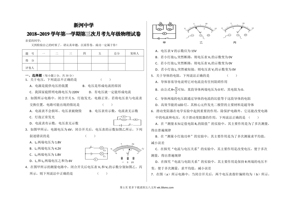 新河中学2018-2019学年第一学期第三次月考九年级物理试卷亲爱的同学:又到检验自己的时候了,请认真审题,沉着答卷,成功一定属于你!一、选择题(每小题2分,共30分)1.关于电压,下列说法不正确的是()A.电...
