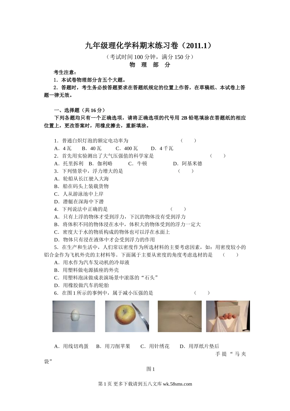 九年级理化学科期末练习卷(2011.1)(考试时间100分钟,满分150分)物理部分考生注意:1.本试卷物理部分含五个大题。2.答题时,考生务必按答题要求在答题纸规定的位置上作答,在草稿纸、本试卷上答题一律无效...