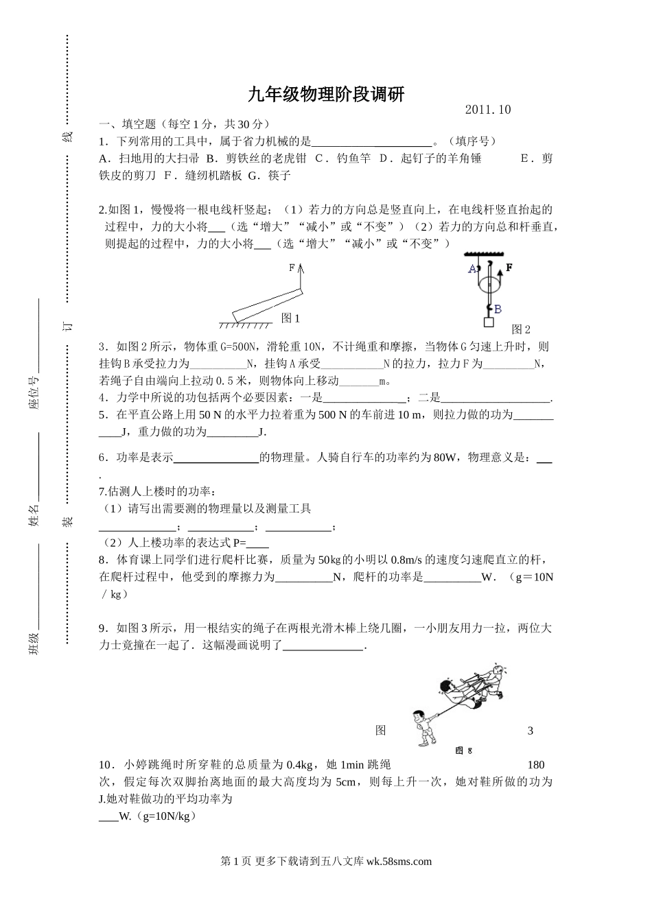 九年级物理阶段调研2011.10一、填空题(每空1分,共30分)1.下列常用的工具中,属于省力机械的是___________。(填序号)A.扫地用的大扫帚B.剪铁丝的老虎钳C.钓鱼竿D.起钉子的羊角锤E.剪铁皮的剪刀F....